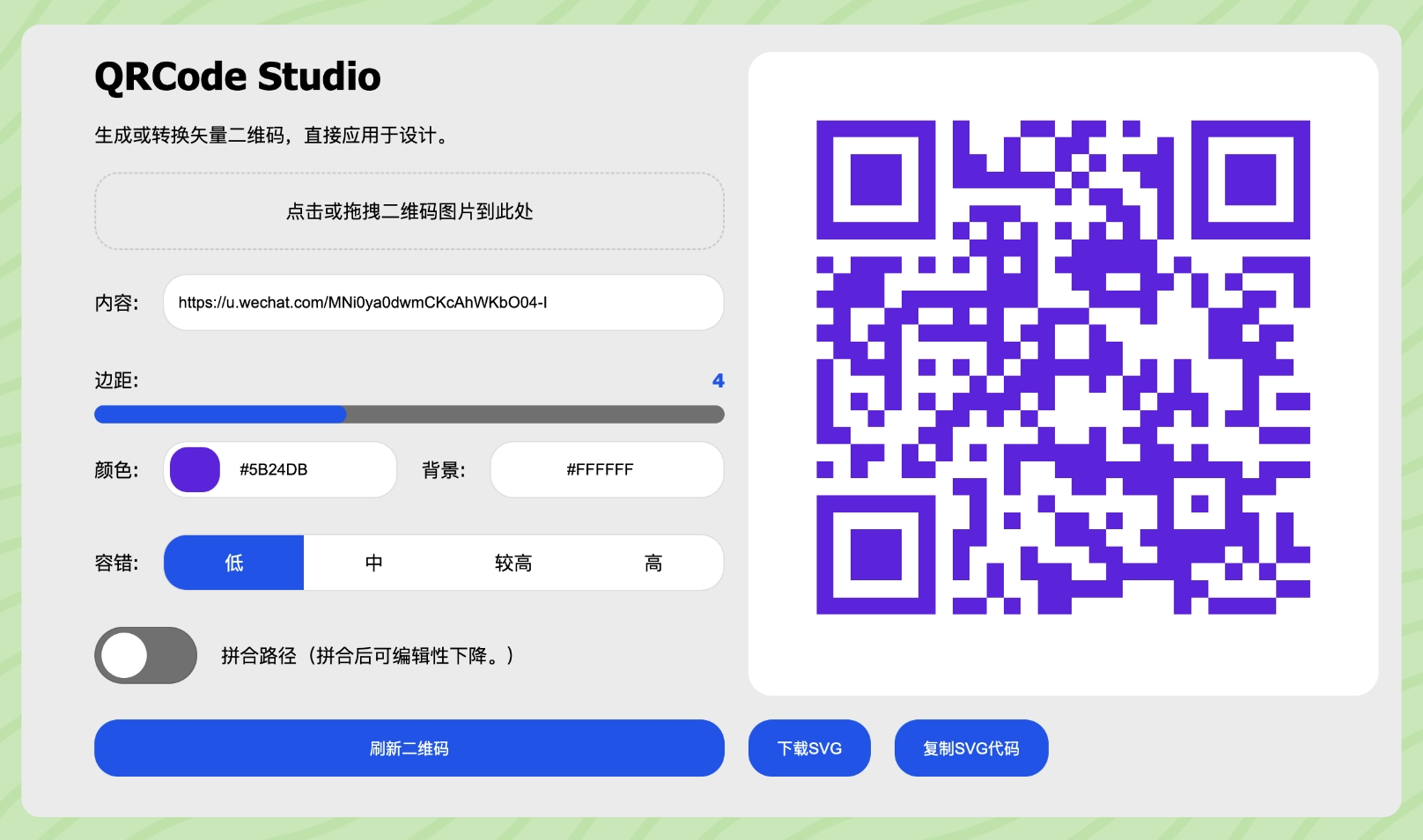 二维码图片转成矢量格式的小工具,支持颜色重置下载 SVG 格式
