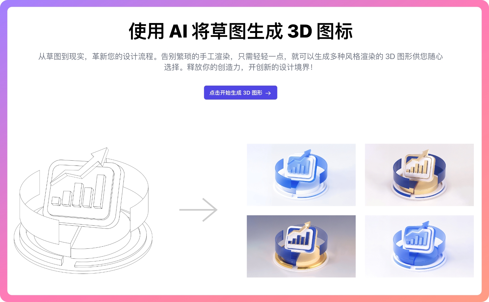 这是一款在线工具,上传线框图的图片生成 3D 质感图标。生成效果还不错只是质量和尺寸不能单独调整,免费可以生成 66 张额度。
