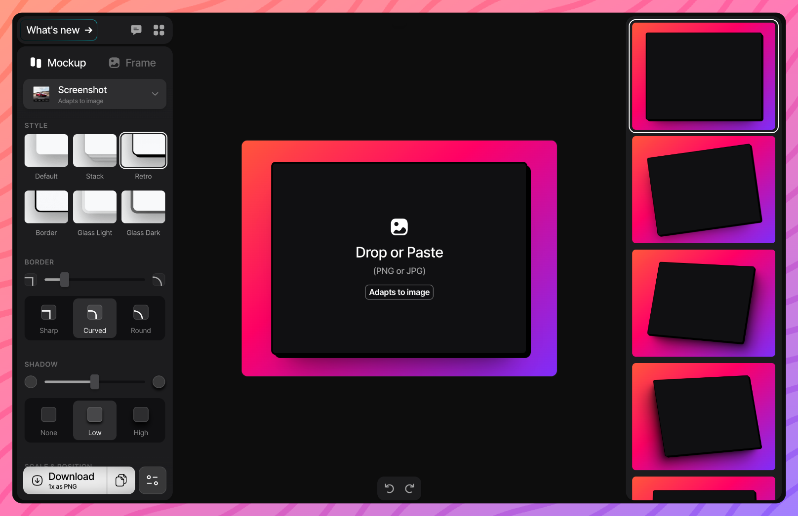 Unsplash & Shots 提供的免费截图美化工具,边框、圆角、投影、模板类型都可以选择。