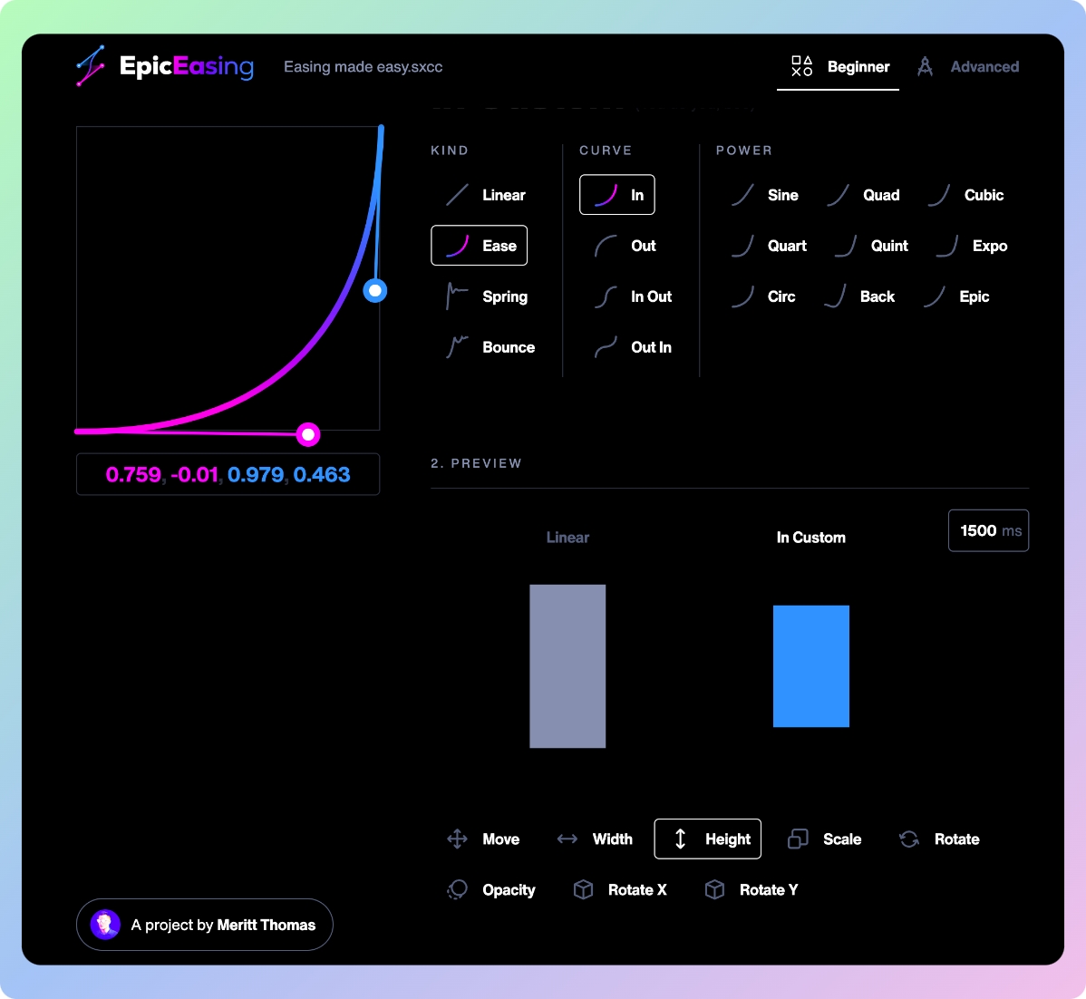 以可视化的方式直观展示动画曲线,支持自定义参数修改并实时预览,支持导出 CSS、Swift、Obj-C 代码。