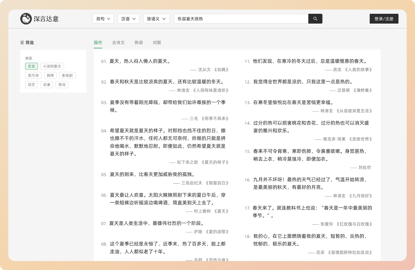 可以根据意思查找相关句子、可以通过字符找句子、也可以查作者、查作品。对于写作者很实用的工具网站。