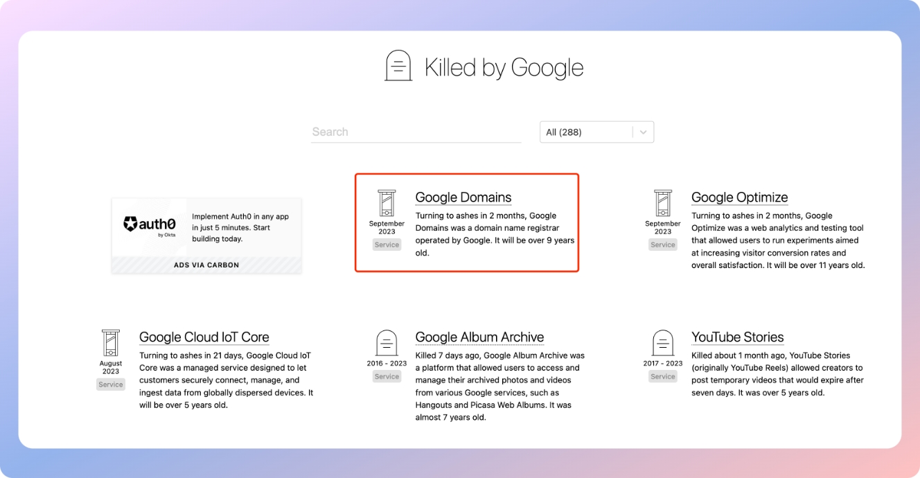 这个网站是谷歌产品墓碑,可以看到以往谷歌停服的产品们和即将停止服务的产品。 https://killedbygoogle.com/