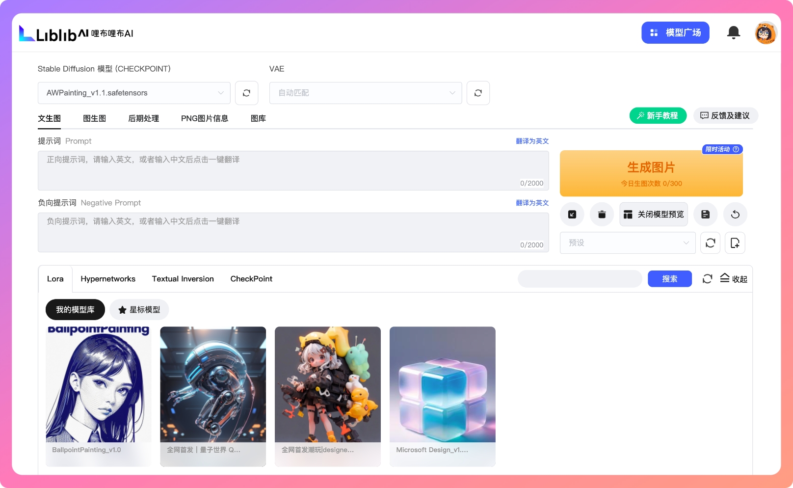 该社区中有 Stable Diffusion 的模型库,模型支持下载和收藏,还可以对模型返图评价。最近还支持了在线生成,社区中的模型可以自由组合,每天免费 3000 次非常良心了。